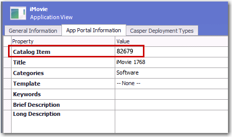 - Click OK. When this application is published to System Center 2012 Configuration Manager, Symantec Altiris Management Suite, or Casper Suite Server, an App Portal catalog item will be automatically created, and the Catalog Item field on the App Portal Information view will display the App Portal Catalog ID for that catalog item: