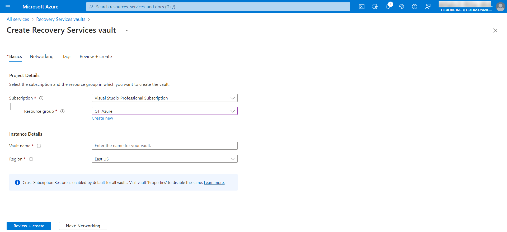 Field Description Subscription This field is pre-populated with the subscription. If required, you can select the required subscription from the drop down list. This is a mandatory field. Resource group This field is pre-populated with the resource group. If required you can add a new resource group by clicking on Create newlink. For more information, see Create Resource Groups. This is a mandatory field.Vault name Enter the unique vault name. This is a mandatory field. Region This field is pre-populated with the region. If required you can select the desired region from the drop down list. -