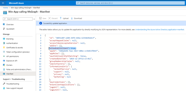 This step is optional as it is only required when AdminStudio wishes to save the user's credentials for authentication. On the application account details page, select Manifest from the left panel. Make sure the application’s allowPublicClient property in the manifest file is set to true (in order for authentication with User name and Password to work).