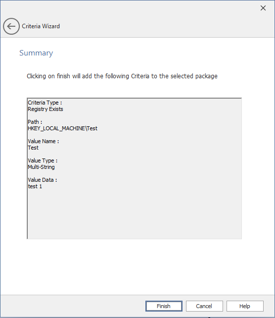 AdminStudio 2025 R2 Help LibraryManaging Applications and Application Catalog DatabasesReferenceWizardsCriteria WizardSummary PanelSummary Panel On the Summary panel, a summary of your selections is listed. Click Finish to add the criteria to the list.