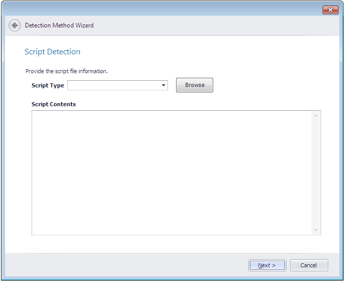 On the Script Detection panel, which opens if you selected Script on the Welcome panel, you specify the script information that you want to use to determine whether an application is installed on a client device.