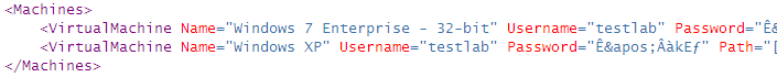 MachinesThe <Machines> element contains multiple <VirtualMachine> elements, which identify the virtual machines that you have added to the project: