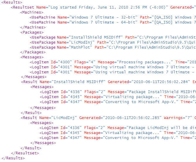 Each <Resultset> element of a <Results> element includes information on <Machines>, <Packages>, <Messages>, and multiple <Result> elements for that run.
