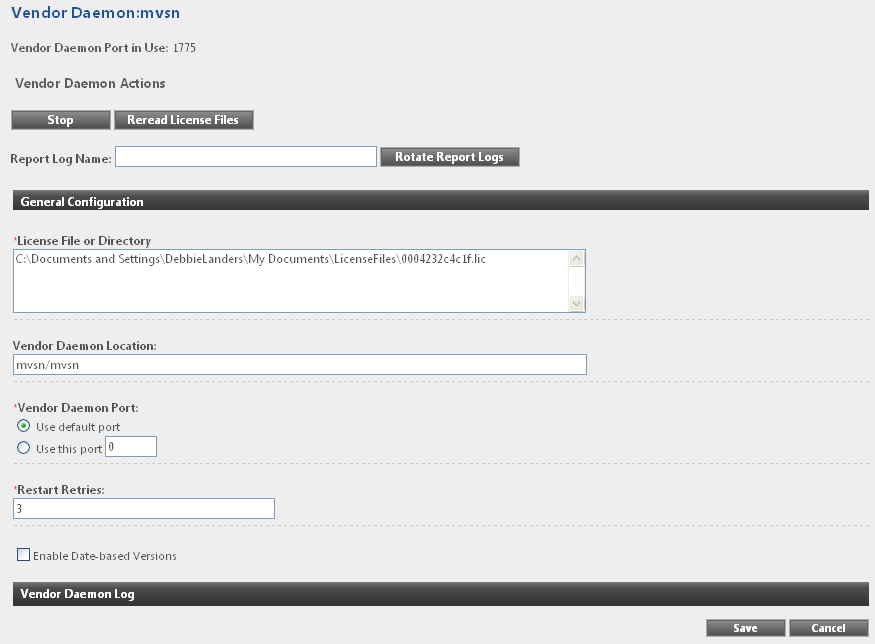 The Vendor Daemon Configuration page in lmadmin enables you to stop a vendor daemon, start a vendor daemon, and reread a license file for a vendor daemon.